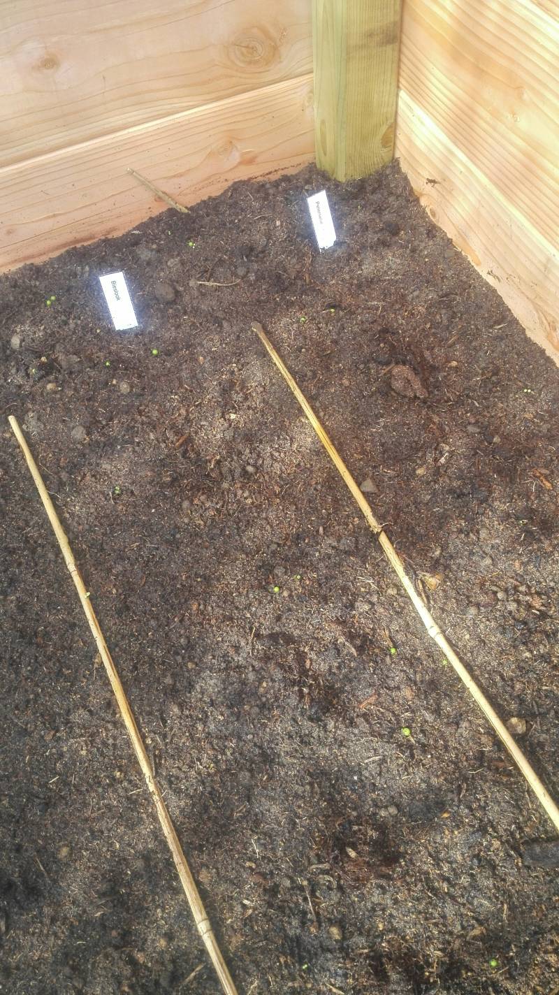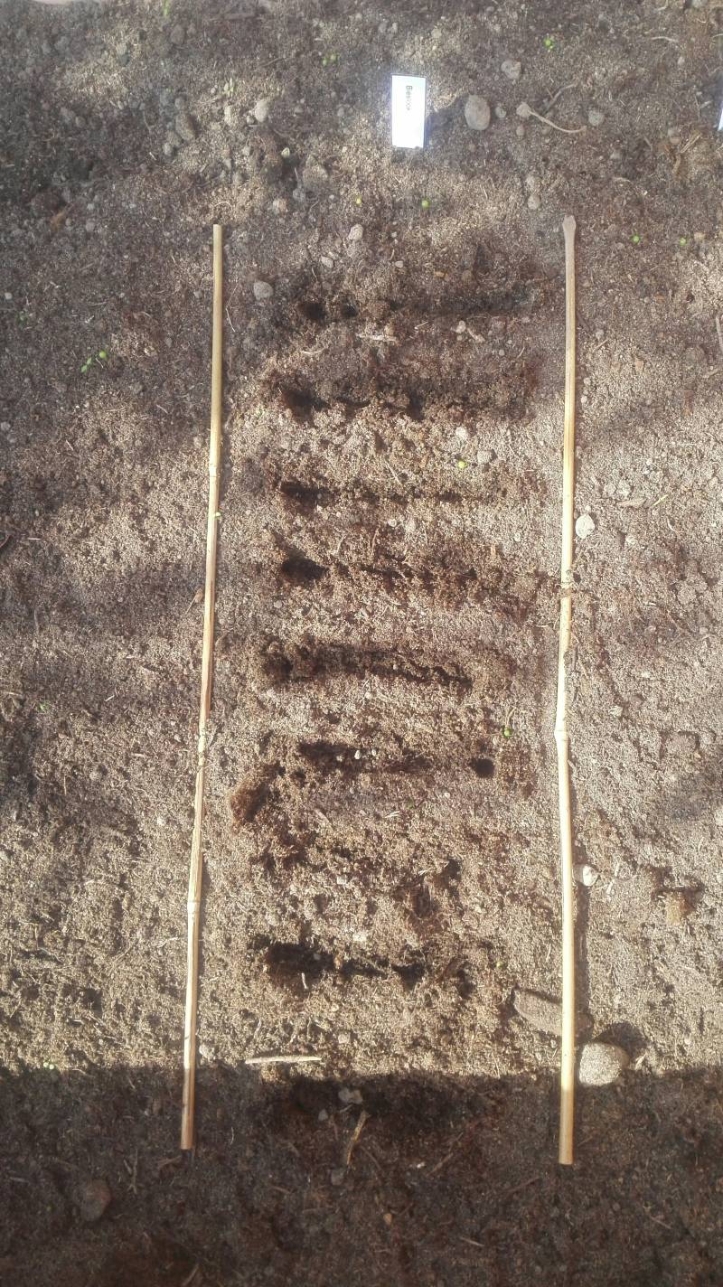 Maak met je vinger horizontale gleufjes. Leg daarin om de halve cm een zaadje.